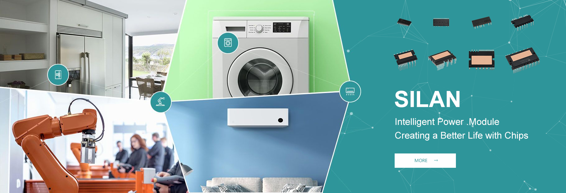 Silan can provide integrated active devices in the fields of white goods and industry, including AC-DC, DC-DC, IPM, Gate Driver, IPM, IGBT, MOS FET, FRD, MCU, etc., and also provides corresponding overall solutions.